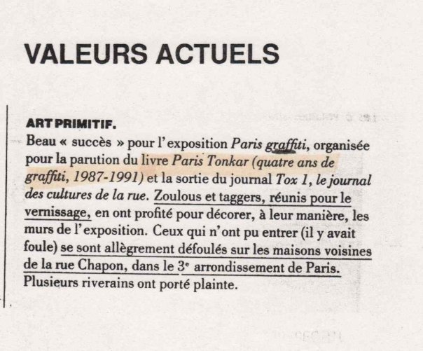 Le livre Paris Tonkar, publié en juillet 1991, a décrit cette aventure unique dans l’histoire de l’art, ces années fastes du graffiti parisien où tout a commencé avec des lettres coulantes, qui ont contribué à faire de Paris un haut lieu du graffiti mondial.