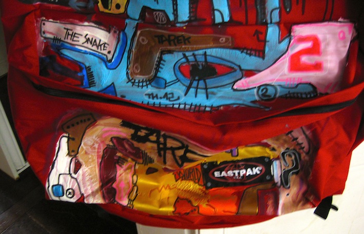 Chaque année depuis 2009, Eastpak met à disposition de 20 artistes contemporains urbains son sac à dos. Chacun a carte blanche pour le taguer, le customiser et se l’approprier. Résultat: la toile du sac se transforme alors en œuvre d’art urbaine. Pour les artistes, ce nouveau support d’expression est un nouveau moyen de faire voyager leur art. Ils s’approprient le sac comme il le ferait pour un mur, un train ou une toile. Tarek a exposé son sac lors de l’exposition Eastpak Tag My « GIANT » Bag, en février 2012. Sac padded Giant d’Eastpack customisé par Tarek (daté 2012 et signé par l’artiste). Il a été peint (face, poche et dos) avec des encres, de l’acrylique et du Posca.