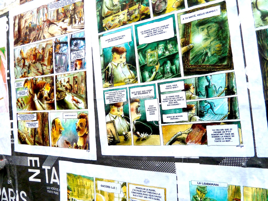 During one of my trips to Paris street art with my fellows Yarps, Mister Pee and Mat Bull, I took the opportunity to paste some first pages and allow comic strip reading on the wall for the public: it is true first premiered in France and around the world!