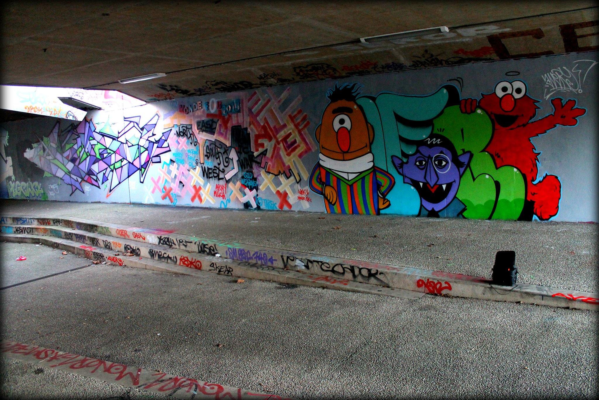 This weekend, I painted a mural entitled Un monde fou 2013 along with graffiti writers from Rennes and Saint-Brieuc: Moner and Skekio (SM crew) and Midj and Averi (WCK crew). I used the spray and acrylic with wood collages.