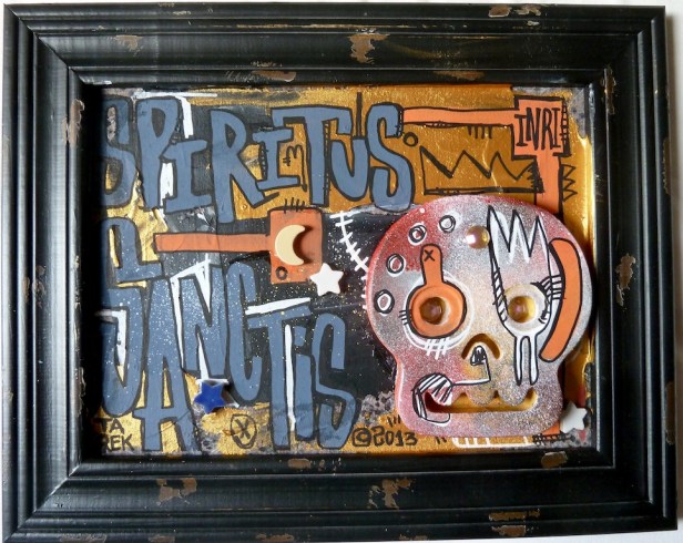 Voici les trois toiles exposées à la galerie Next Door de Genève en Suisse. C’est un triptyque : peinture sur bois avec cadre, collages, acryliques et encres, 2013.