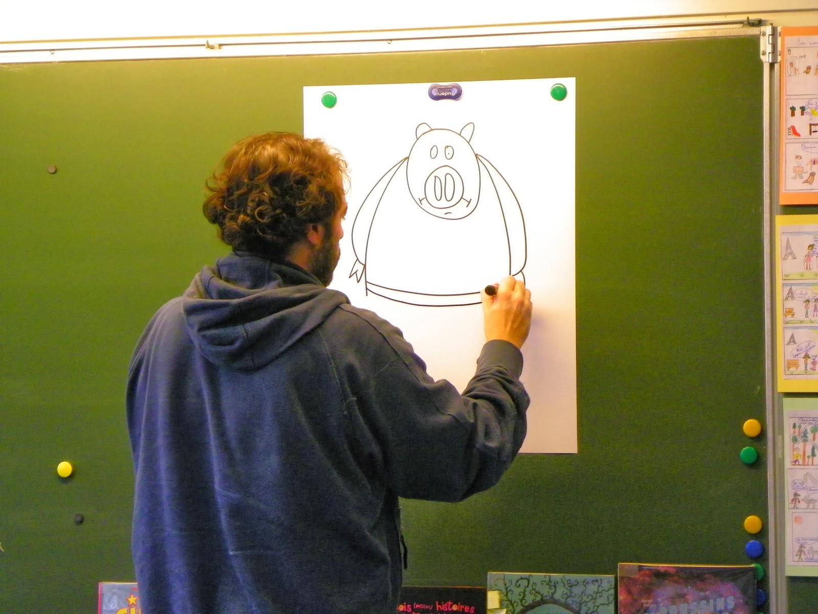 I have been in the Doubs department in Valentigney to meet children from two classes CM (Donzelot School, 1 rue Louis Pergaud Valentigney 25700) … We talked about my comics then we drew … Finally, I made a collage in school and I showed paintings.