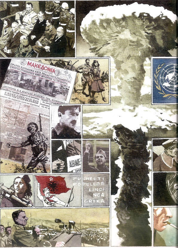 A partir de cette planche (p. 20 du tome 1) de la bande dessinée du scénariste français Tarek et du dessinateur belge Vincent Pompetti (Sir Arthur Benton : L’intégrale : Cycle 2 : La Guerre froide, Livre 1 : L’organisation.- Emmanuel Proust Editions, collection Trilogies, 2011 / 50 pages : Emmanuel Proust Editions : http://www.epeditions.fr/) (http://clio-cr.clionautes.org/spip.php?article3422) et de ses annexes (dossier Guerre froide, filmographie, bibliographie), les élèves pourront mener un travail de réflexion et de recherches sur la guerre froide. La période 1945 – 1953 est marquée par la constitution des blocs de l’Ouest et de l’Est dominés respectivement par les États-Unis et l’Union soviétique, autour desquels la majeure partie des pays se sont regroupés. Staline meurt le 5 mars 1953, il s’ensuit une période d’instabilité du pouvoir à la tête de l’Union soviétique qui verra se conclure la partition de l’Allemagne ainsi que les conflits en Corée et en Indochine, traçant durablement les frontières entre les deux blocs. Cette période est aussi celle de la plus grande supériorité stratégique nucléaire des États-Unis, qui pour autant n’auront pas vraiment profité de leur avantage en la matière.