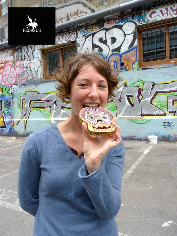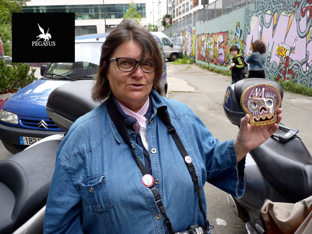Lors d’une session de collage à Paris, j’ai demandé à des personnes de poser avec un de mes Skulls. Michelle, photographe américaine, présente au Frigo en a fait l’acquisition.
