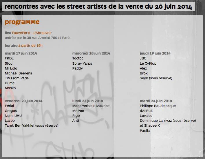 FauveParis et l’unité locale de la Croix-Rouge française du 9e arrondissement de Paris organisent le 26 juin 2014 une vente aux enchères d’artistes issus du street art au profit de l’association, qui fête cette année ses 150 ans.