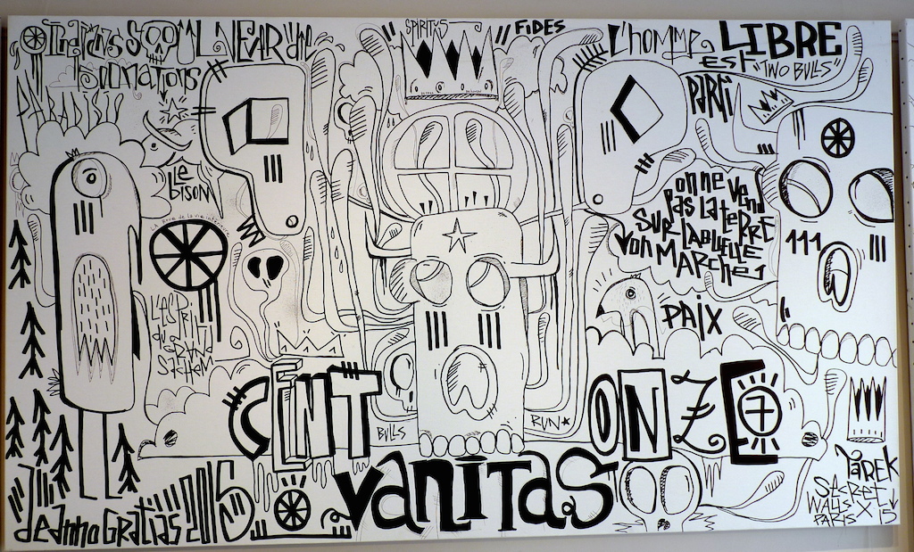 Les deux toiles réalisées lors de Secret Walls 2015 : « Vanitas » (Poca sur toile, 159×120 cm) et « People or animalz ! » (Poca sur toile, 159×120 cm).