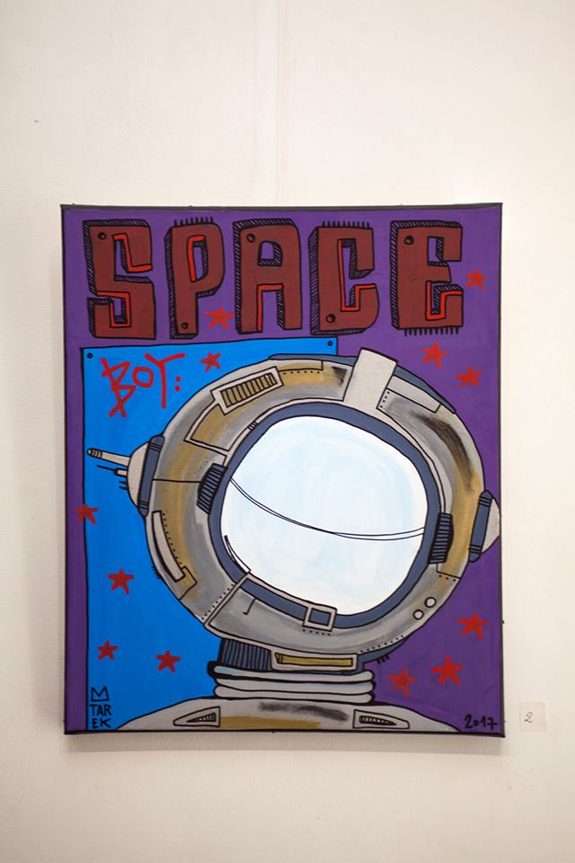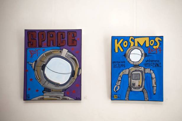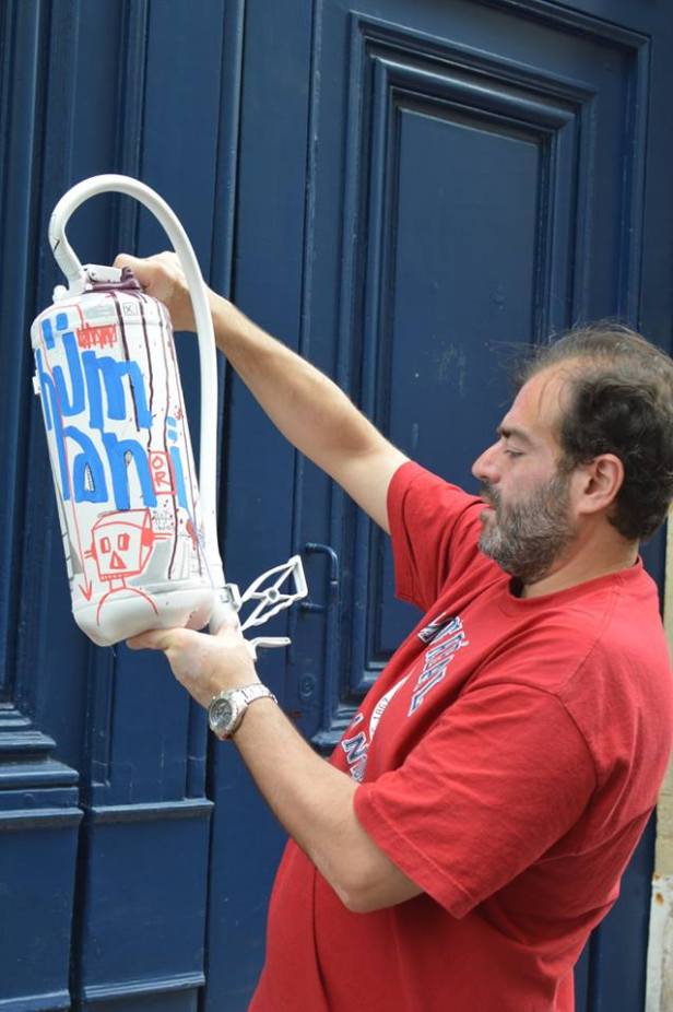 J’ai peint en direct un extincteur tandis que Mat Elbé réalisait un pochoir non loin de moi… Il est disponible à la galerie.