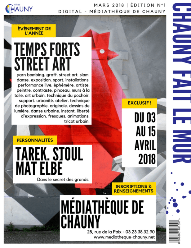 Résidence artistique | Exposition Tarek & Mat Elbé du 10 avril au 26 mai 2018 à la médiathèque de Chauny | peintures murales en ville et dans les écoles.