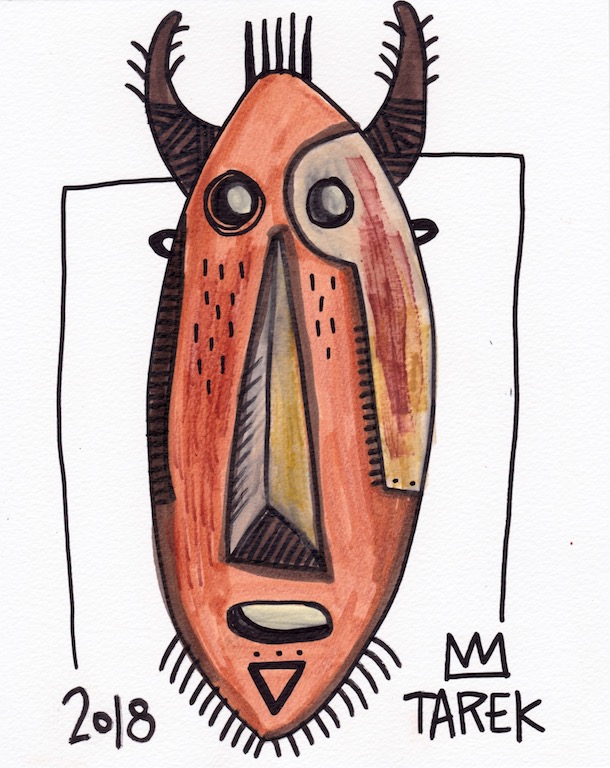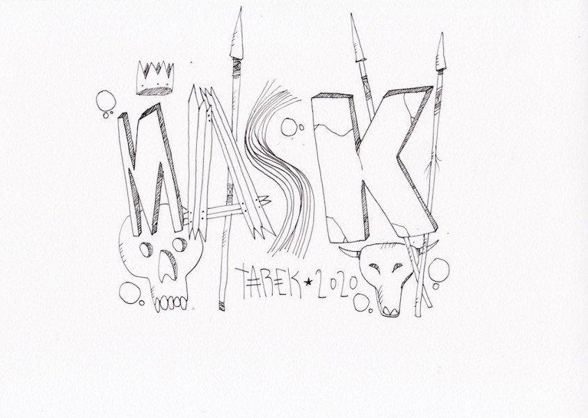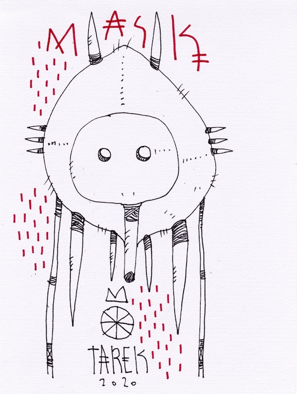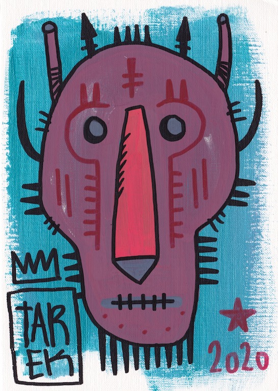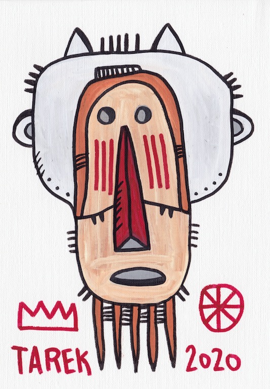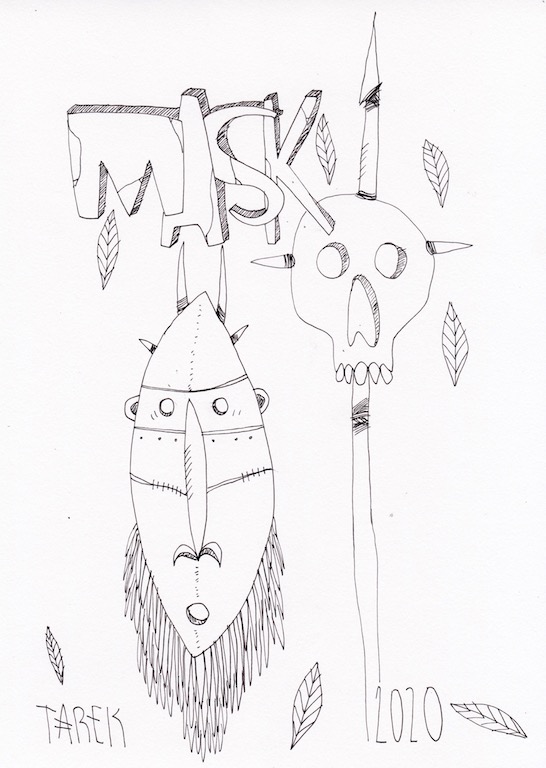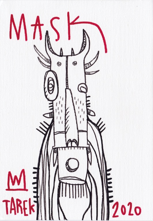 L’idée de customiser des masques ou d’en peindre n’est pas récente dans le travail de Tarek puisque il avait déjà réalisé quelques pièces dès 2010. Lors de son séjour au Cameroun, en 2017, il a peint des murs et il a également partagé sa passion avec d’autres peintres camerounais. Sur place, il a pu faire l’acquisition de nombreux masques africains qui ont été des sources d’influence pour son travail. De retour en France, il a customisé une partie de ceux-ci et peint une grande série de toiles intitulée « Masque(s) » … Ce thème lui tient à cœur depuis longtemps puisqu’à de nombreuses occasions il a peint des toiles avec des masques et il a réalisé plusieurs dessins sur cette thématique. Sa série « Tribal » tout comme « Homme des bois » ont généré également des masques fictifs d’inspiration africaine …