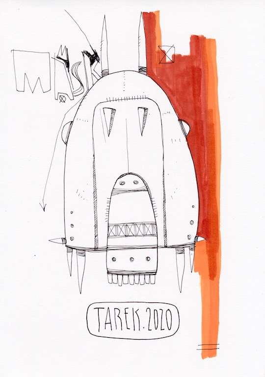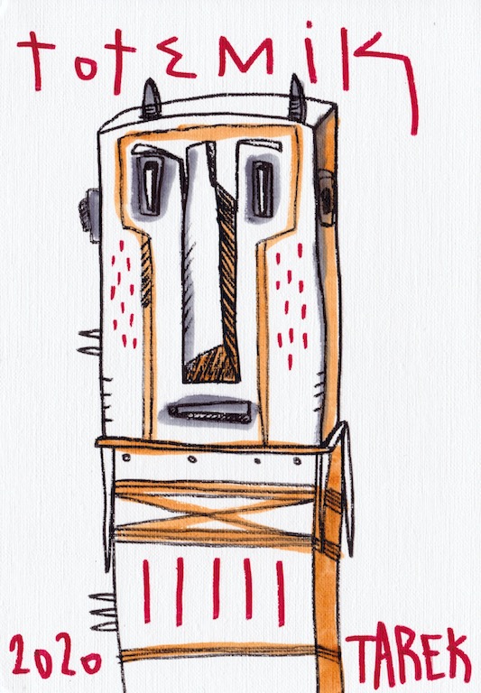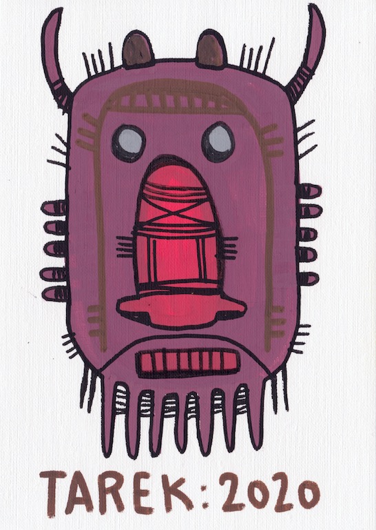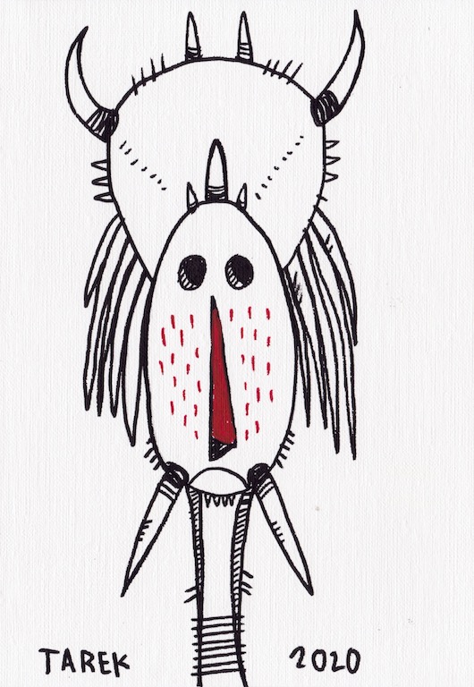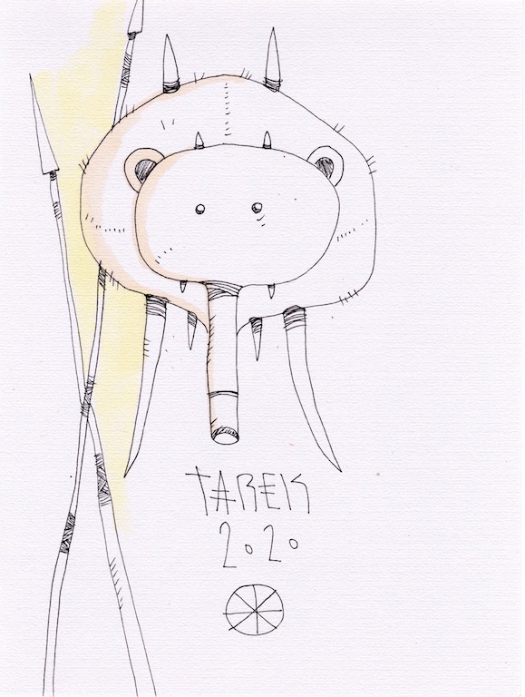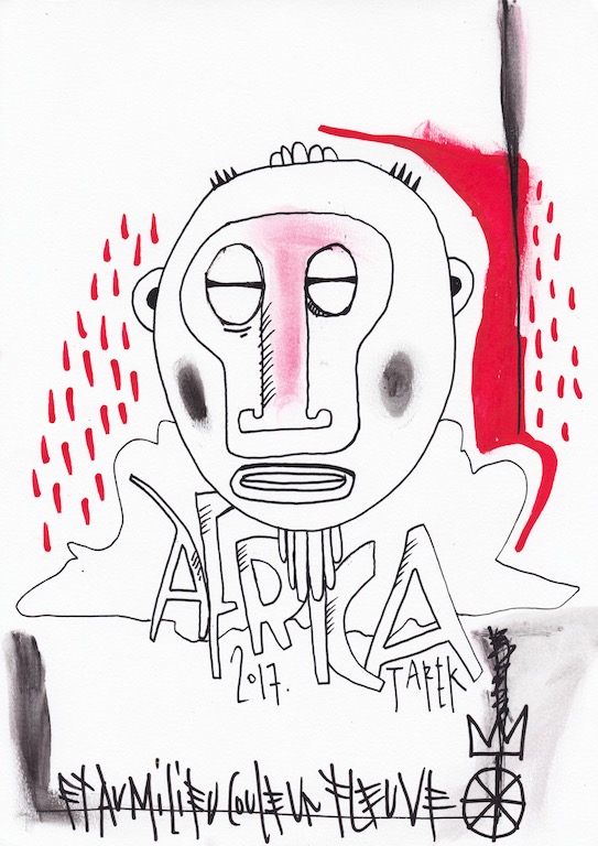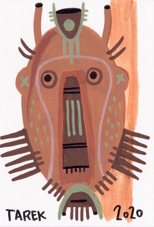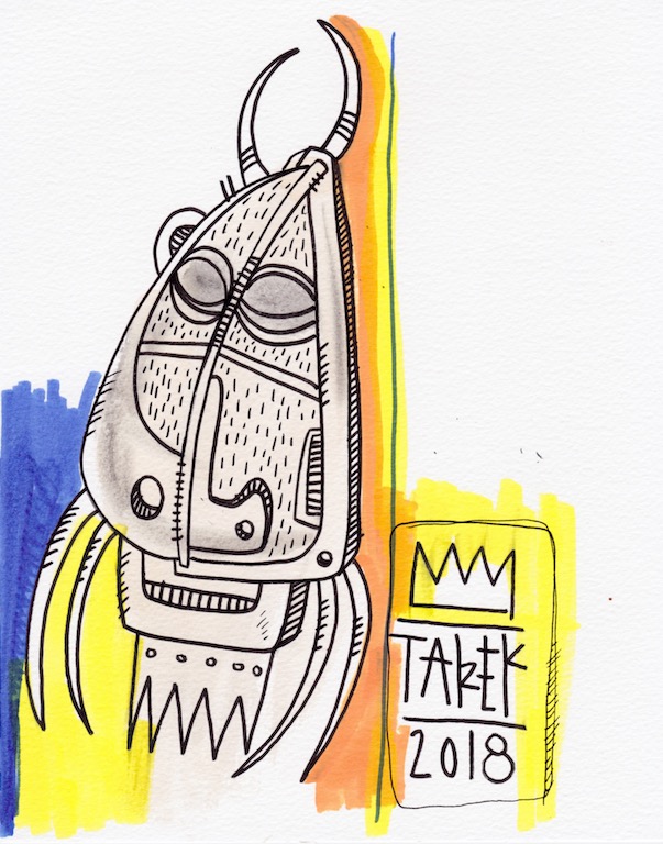 L’idée de customiser des masques ou d’en peindre n’est pas récente dans le travail de Tarek puisque il avait déjà réalisé quelques pièces dès 2010. Lors de son séjour au Cameroun, en 2017, il a peint des murs et il a également partagé sa passion avec d’autres peintres camerounais. Sur place, il a pu faire l’acquisition de nombreux masques africains qui ont été des sources d’influence pour son travail. De retour en France, il a customisé une partie de ceux-ci et peint une grande série de toiles intitulée « Masque(s) » … Ce thème lui tient à cœur depuis longtemps puisqu’à de nombreuses occasions il a peint des toiles avec des masques et il a réalisé plusieurs dessins sur cette thématique. Sa série « Tribal » tout comme « Homme des bois » ont généré également des masques fictifs d’inspiration africaine …