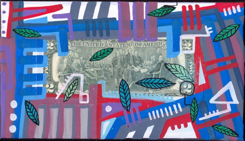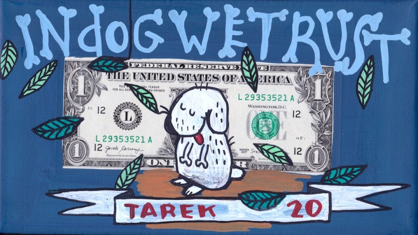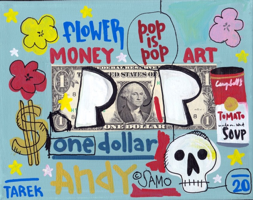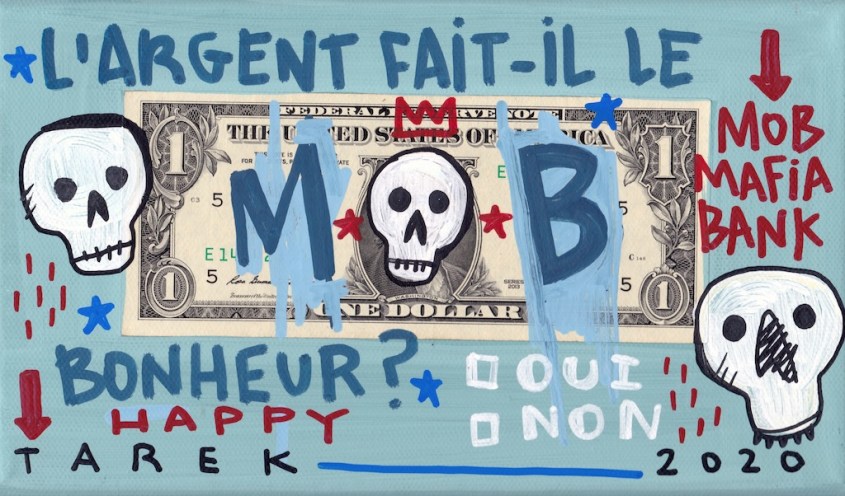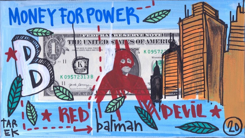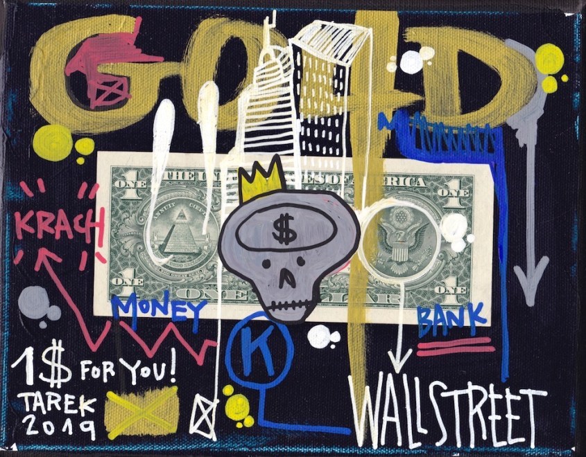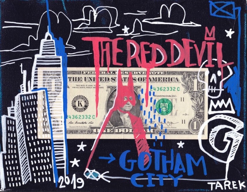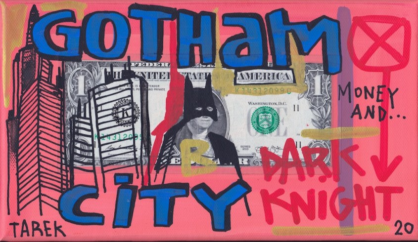 Cette série de peintures tente d’explorer toutes les possibilités graphiques en détournant et en réactualisant les thèmes du Pop art ainsi que de la pop culture. Les univers warholien ainsi que celui du comics servent de base de travail à cette exploration. Wall-Street, temple du capitalisme américain caractérisé par un billet de 1 dollar sur lequel on devine l’ombre de Batman. Entre Gotham City et New York, entre rêve et réalité, l’artiste TAREK ne peut choisir.