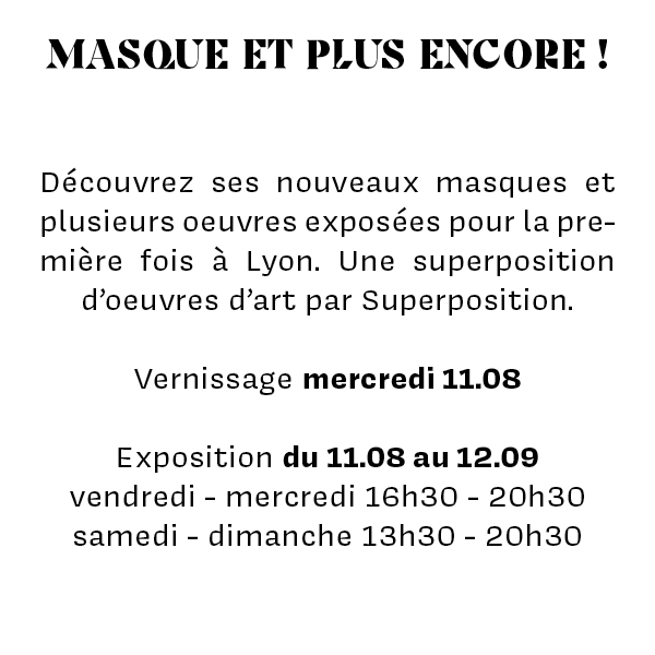 Lors de ma première exposition solo à Lyon avec la galerie Superposition, à l’époque située rue Longue, j’avais peint toute cette ruelle durant une semaine. De nombreux masques avaient pris forme et les rayons du soleil, qui pénétraient dans cet endroit emblématique, éclairaient tel ou tel masque selon le moment de la journée… Par la suite, j’ai peint des masques lors d’éditions de l’Urban Jungle festival auxquelles j’ai participé et lors de l’in-situ à Confluence… Mon histoire avec cette galerie est liée aux masques et… bien plus encore.Vous pourrez découvrir de nouveaux masques et des oeuvres exposées pour la première fois à Lyon. Une superposition d’œuvres d’art par Superposition.