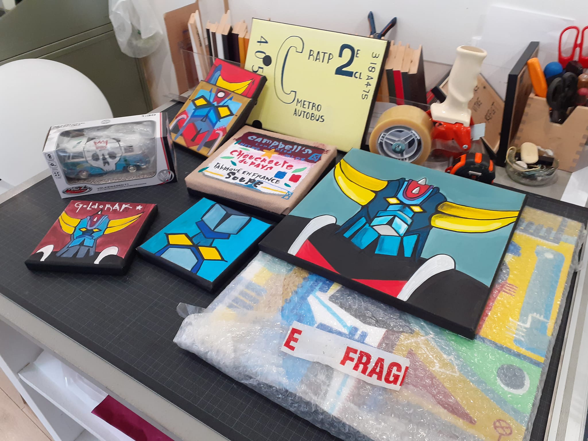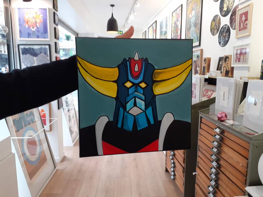 De nouvelless peintures et des customs sont disponibles à la Galerie L’oeil ouvert à Paris dans le quartier de République dont des des peintures de la série Goldorak.