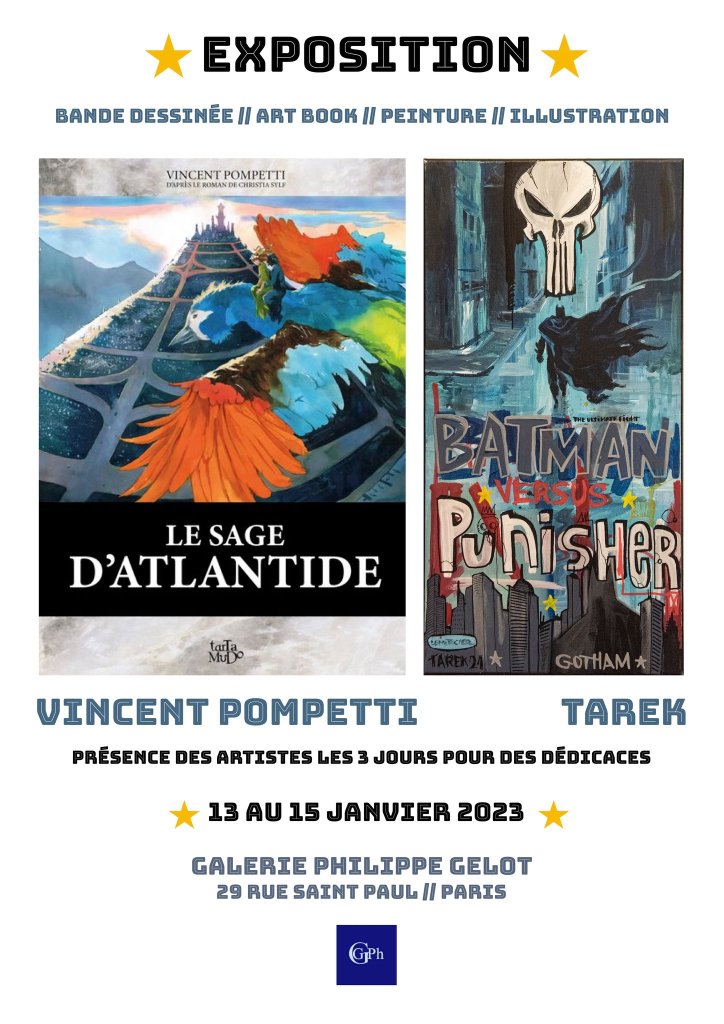 Nous commencerons cette nouvelle année sur une une touche colorée et artistique avec deux de nos artistes de la galerie. Vincent Pompetti nous présentera en avant-première à Paris, Le Sage de l’Atlantide, sa dernière BD publiée chez Tartamudo ainsi que ses illustrations. Quant à Tarek, il exposera ses dernières peintures et dessins réalisés en décembre 2022 pour cet événement.