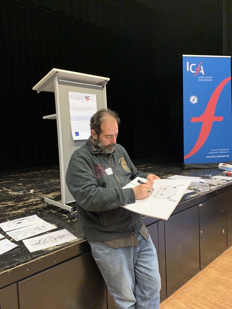 Les images du Workshop sur le thème de l’amitié franco-allemande dans un Gymnasium à Tübingen. Un grand merci à Ariane, Sonia (pour les photos) et toute l’équipe du centre culturel franco-allemand. J’ai offert des dessins originaux en cadeau aux élèves et aux lycées et j’ai également customisé le déambulateur appartenant à une jeune élève.