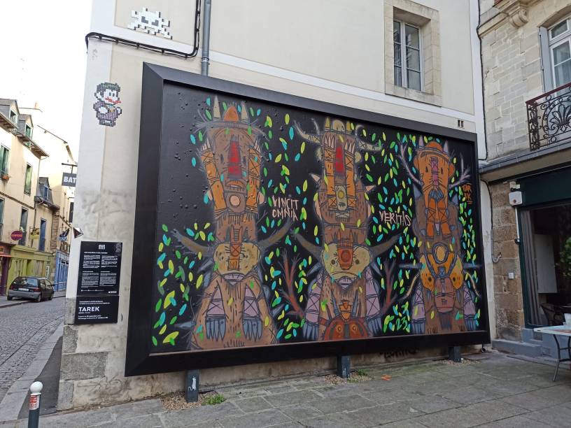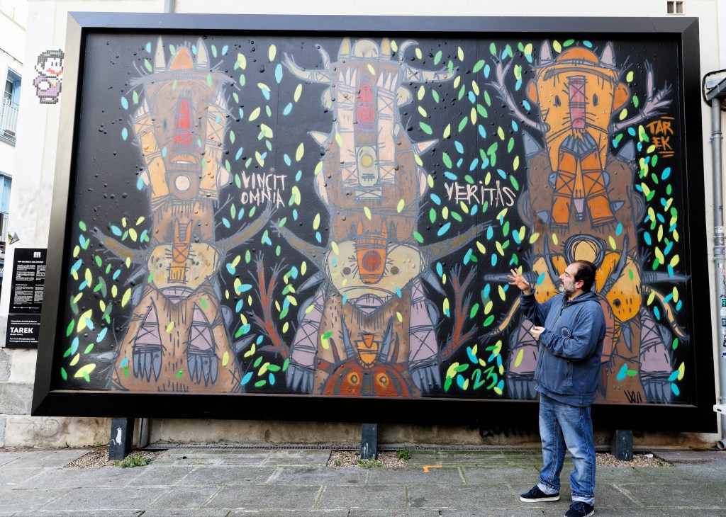 La vérité finit toujours par triompher, telle est la devise de ce mur réalisé par Tarek. Dans une époque où tout n’est qu’illusion, l’artiste a voulu interpeller les passants et toutes les personnes qui viendront devant le MUR. Aussi, les trois totems représentent-ils les trois singes de la sagesse, « ne rien voir, ne rien entendre et ne rien dire ». Ceux-ci nous donnent à réfléchir sur nos actes, nos paroles et nos actions au quotidien. Que faire quand le faux remplace le vrai, quand le médiocre est promu et le compétent ignoré ! Les feuilles qui dansent autour des totems annoncent l’automne… le temps des changements mais aussi de la transitions intérieure.