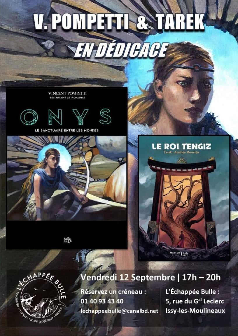 Le vendredi 12 septembre de 17h à 20h, Vincent Pompetti et Tarek pour Onys et Le Roi Tengiz (dessin d’Aurélien Morinière). Fantasy, Science fiction et médiéval fantastique. Il y en aura pour tous les goûts !
