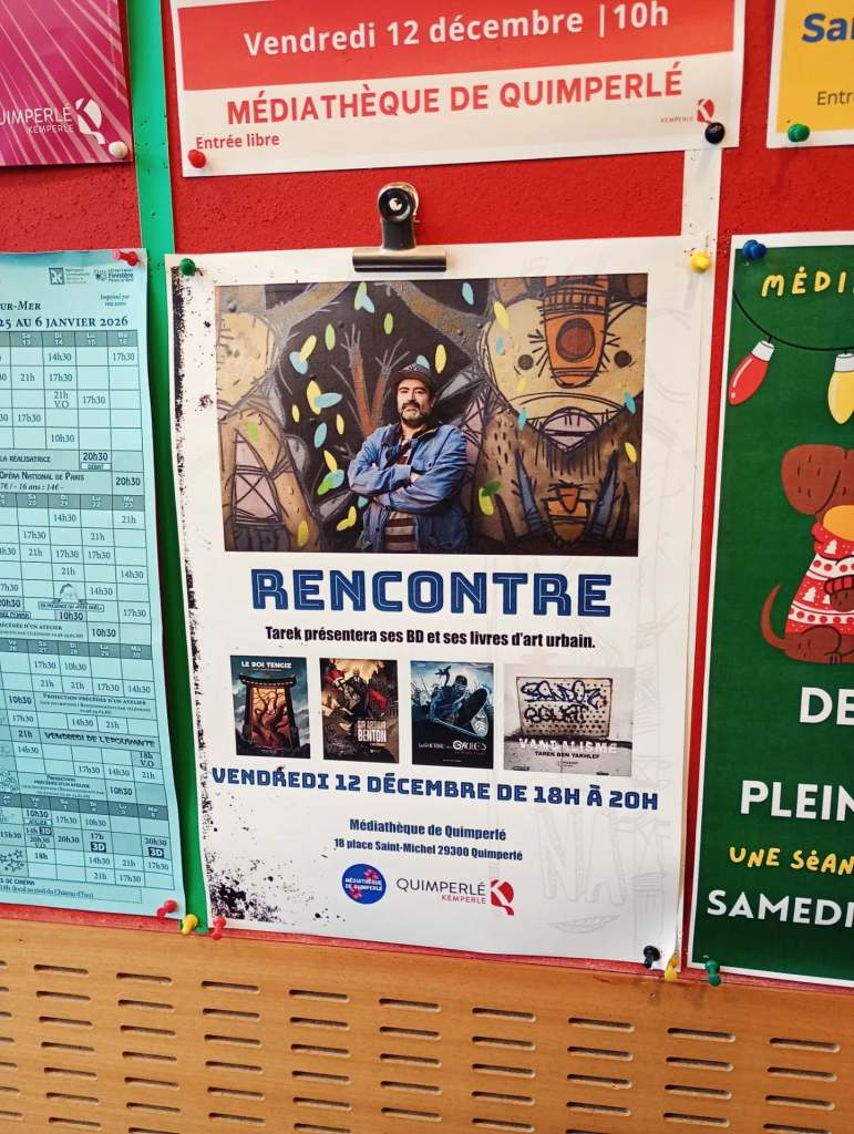 Des images de la rencontre à la médiathèque de Quimperlé. Tarek y a présenté sa dernière BD Le Roi Tengiz (au dessin Aurélien Morinière) chez Massot éditions & Tartamudo éditions. Un récit épique qui se déroule dans les steppes asiatiques.