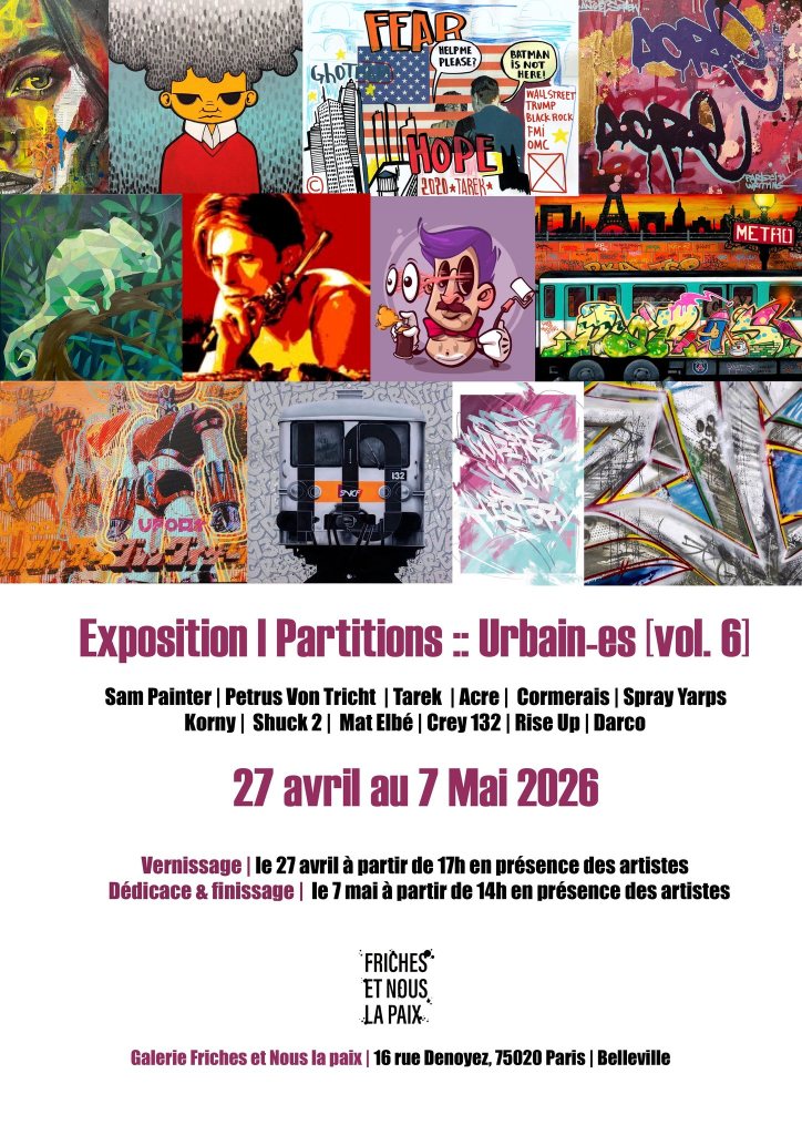 La Galerie Friches et Nous la paix vous invite à découvrir Partitions :: Urbain-es [vol. 6], une exposition collective réunissant : Sam Painter | Petrus Von Tricht | Tarek | Acre | Cormerais | Spray Yarps | Korny | Shuck 2 | Mat Elbé | Crey 132 | Rise Up | Darco
