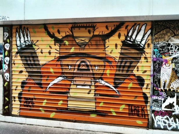 In 2016 in Hamburg (Germany), Tarek exhibited his works in several places and in two galleries (Bateau culturel MS Stubnit, at the Kunsthaus an der Alster and at the Studio Longboard): he became known to the French community living in this city. He went to the Festiv’art in Kribi (Cameroon) during which he painted many walls with Simon Binna, Rostand Pokam, and other Cameroonian painters. In 2017, several personal and collective exhibitions punctuated his painting and comic book work: from Rennes to Lyon, from Moulins to Paris via Hamburg, Sao Paulo, Brussels, Montreal, and Andenne, the public appreciated and bought his productions. New galleries sold his works: Superposition (Lyon), No Galerie (Rennes), Sub Galeria (Sao Paulo), Galerie JPHT (Paris 3e) and Galerie Anthony Roth Contemporain (Paris 3e). Some of his paintings joined the MoLA museum collection following an auction at Drouot (Paris) at the end of the year.