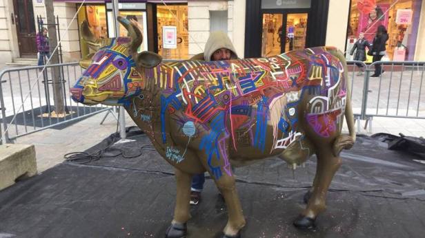 Cow geometrik performed during a live painting at Moulins in February 2018. This cow is exposed on the banks of the Allier.