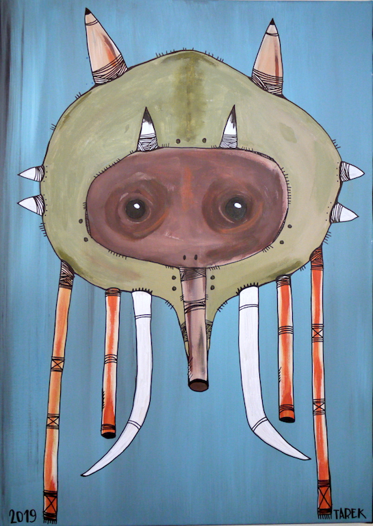 L’idée de customiser des masques n’est pas récente dans le travail de Tarek puisqu’il a déjà réalisé quelques pièces entre 2010 et 2018. Lors de son séjour au Cameroun durant lequel il a peint des murs, partager avec d’autres peintres ou encore discuter avec les personnes qui ont découvert son travail, il a acquis de nombreux masques africains.