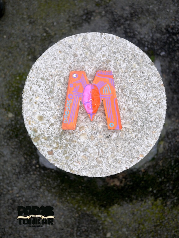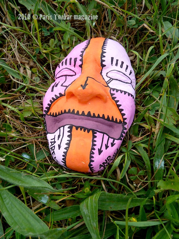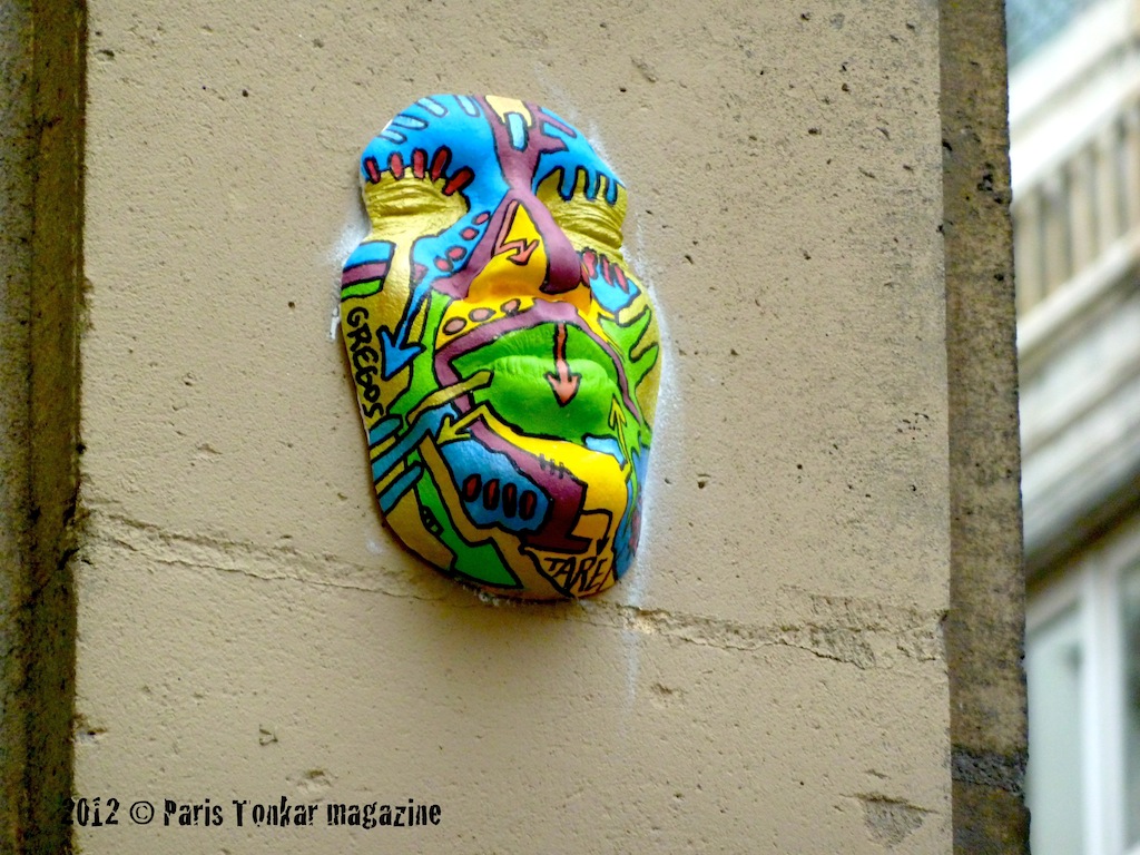 Depuis mars 2011, j’ai une collaboration artistique avec l’artiste Gregos. Il me donne à peindre les visages moulés qu’il a conçu. Après ma mise en couleur, Gregos les colle sur un mur ou un endroit visible dans la ville. Nous en sommes à une quinzaine déjà ! Il m’est aussi arrivé de les coller, essentiellement en Bretagne. A ce jour, il y a eu des collages à Paris, en Guyane, Brest, Saint-Brieuc, Rennes, Athènes en Grèce et Los Angeles aux États-Unis. En outre, Gregos a collé certains de mes Men at work et mes Girls in the city lors de ses voyages.