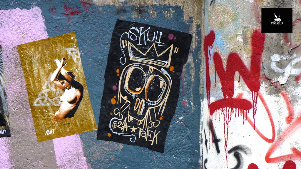 Collage of Skulls artwork painted by me and then laid in the street in broad daylight. Each artwork is signed. Before gluing, a photo of my artwork is systematically taken in a unique place or outside with minimal staging. Cities where collages were made: France (Agen, Arras, Bourges, Chauny, Gentilly, Ivry-sur-Seine, Laval, Lorient, Lurcy-Levis, Marseille, Merlieux, Montrouge, Moulins, Niederbronn, Pacé, Paris, Puteaux, Rennes, Saint-Malo, St. Denis, Saint-Ouen, and Valenciennes), Athens, Brussels, Montreal, New York, and Rabat.
